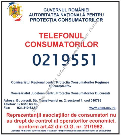 - Mentiunea expresă: "Telefonul Consumatorilor 0219551". Acesta este numărul unic de contact la nivel național pentru problemele consumatorilor.